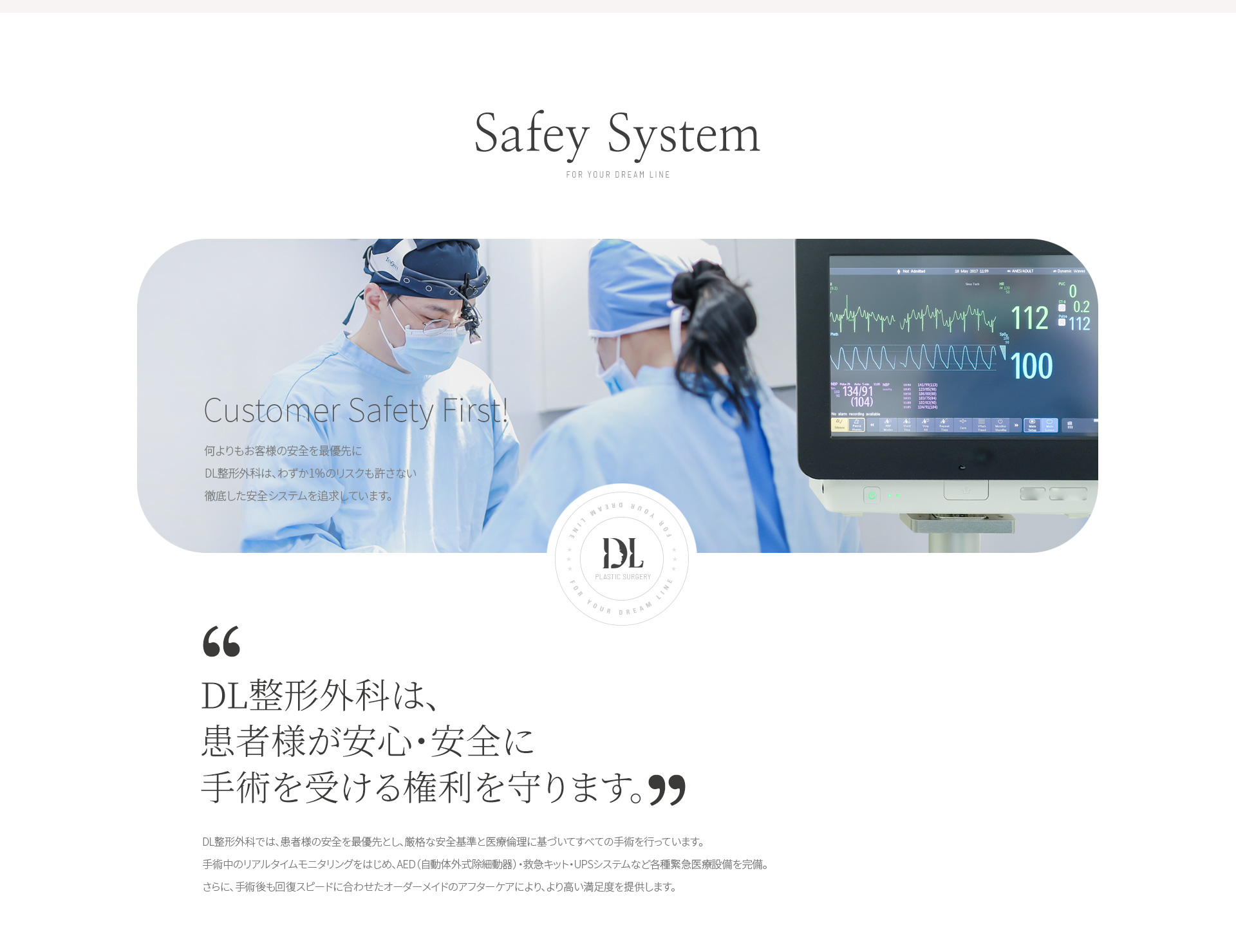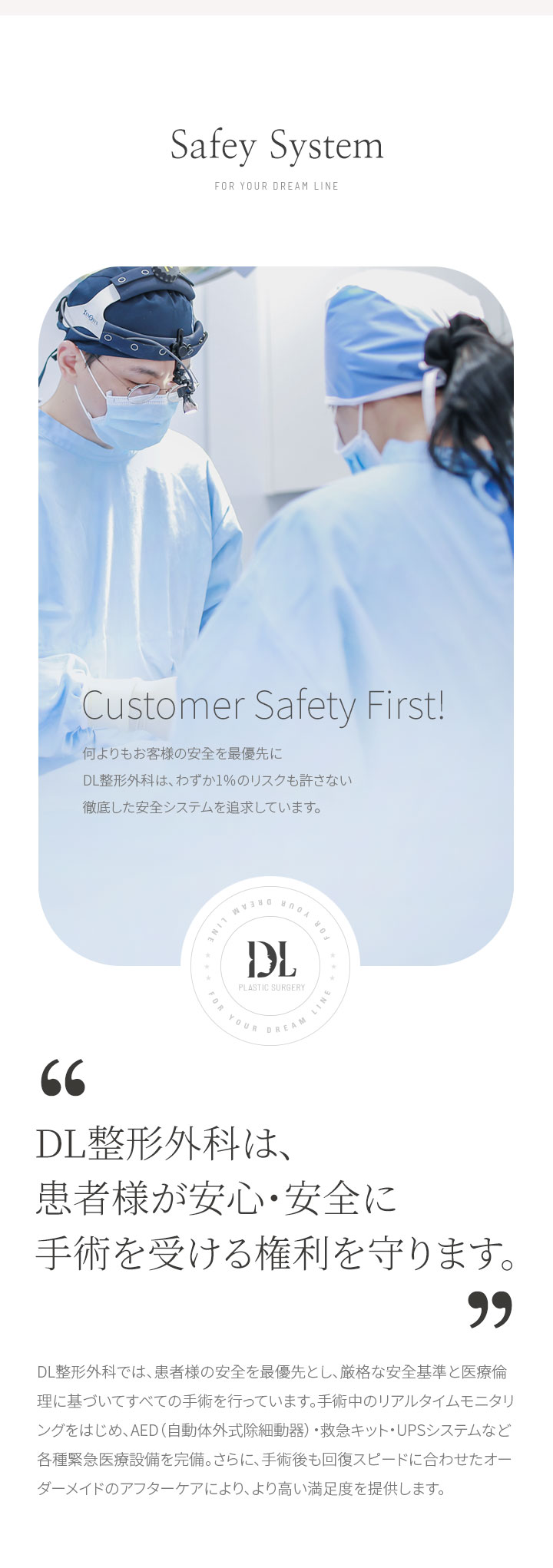 DL整形外科は、わずか1%のリスクも許さない徹底した安全システムを追求しています。
